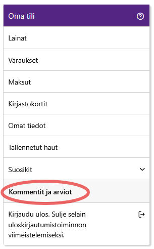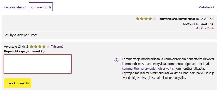 Uutena ominaisuutena on se, että voit tarkastella SEAMK-Finnassa antamiasi kommentteja ja arvioita Omassa tilissäsi. Voit halutessasi poistaa jonkin kommenttisi tai arviosi. Klikkaamalla teoksen nimeä, siirryt kyseiseen teoksen tarkkoihin tietoihin ja voi muokata aikaisemmin antamaasi kommenttia tai arviota Kommentit-välilehdellä.