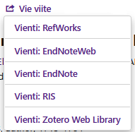 Voit tallentaa haluamasi teoksen viitetiedot käyttämääsi viitteidenhallintajärjestelmään. Uutena on mahdollisuus viedä viite suoraan Zoteroon. Aikaisemmat vientimahdollisuudet ovat RefWorks ja EndNote viitteidenhallintaohjelmat, sekä RIS-tiedostomuoto, joka mahdollistaa eri viitteidenhallintaohjelmien välisen viitteiden siirron.